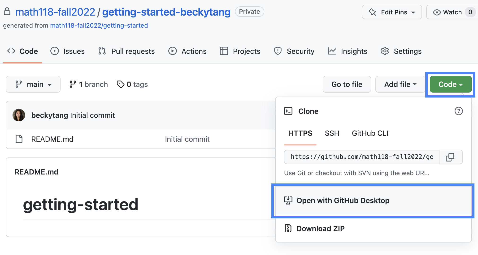 Click on the green Code button, and select the option Open with GitHub Desktop