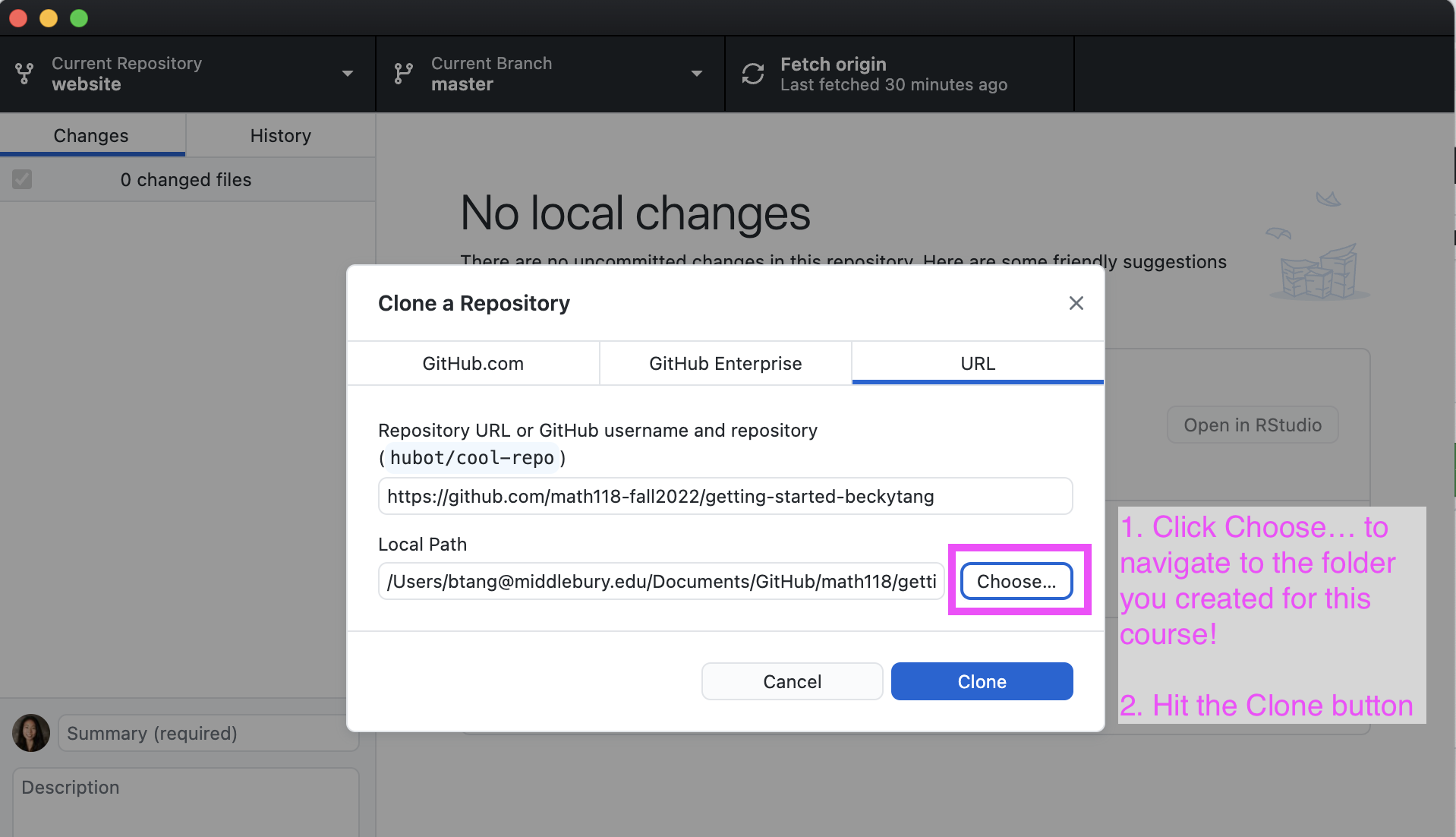 The GitHub Desktop application will open up, with a white window that says “Clone a Repository”. Important: in the second line that says “Local Path”, there is a button that says Choose… Click on it, and select the Math 218 folder you created from this course. Then hit the blue Clone button.