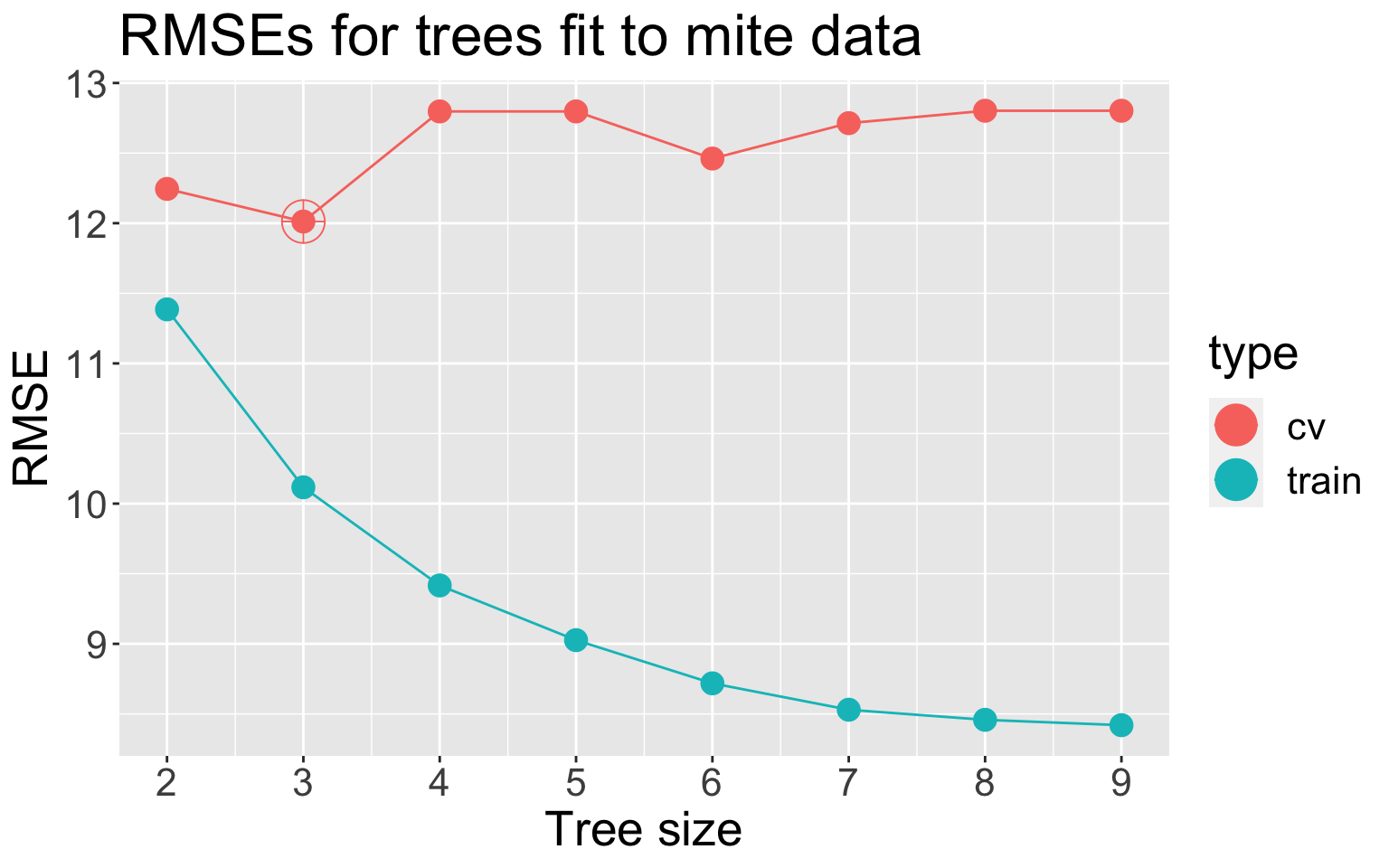 k-fold CV with k = 5. Best CV RMSE (red) at 3 leaves , so this would be our “best” tree