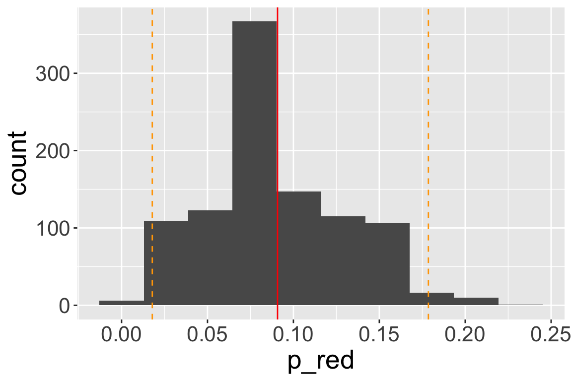 After 1000 bootstrap samples, we end up with 1000 estimates for \(p_{red}\)