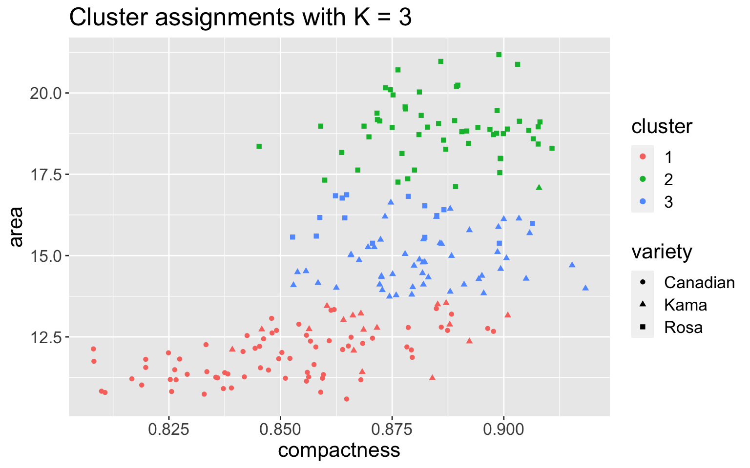 Run \(K\)-means with \(K = 3\), using features compactness and area