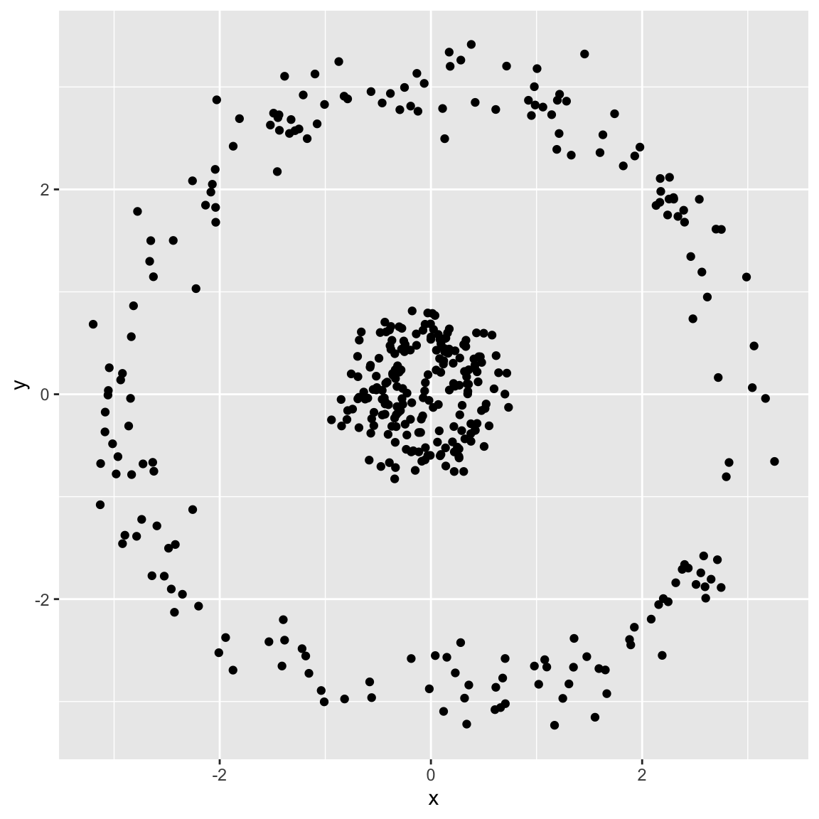 Generated three clusters with differing densities (number of observations), \(n = 20, 100, 500\)
