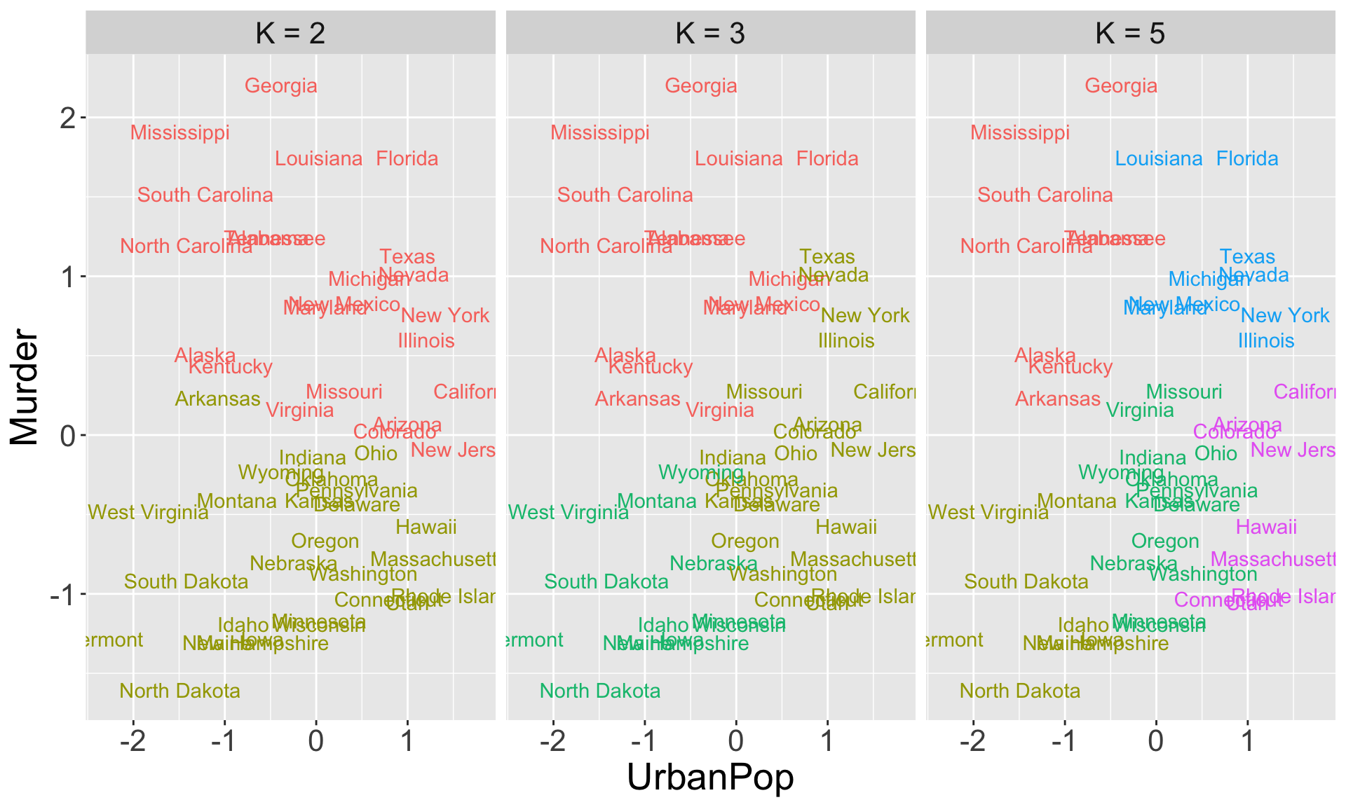 In the following slide, I apply \(K\)-means clustering with different values of \(K\) to group the observations (states)