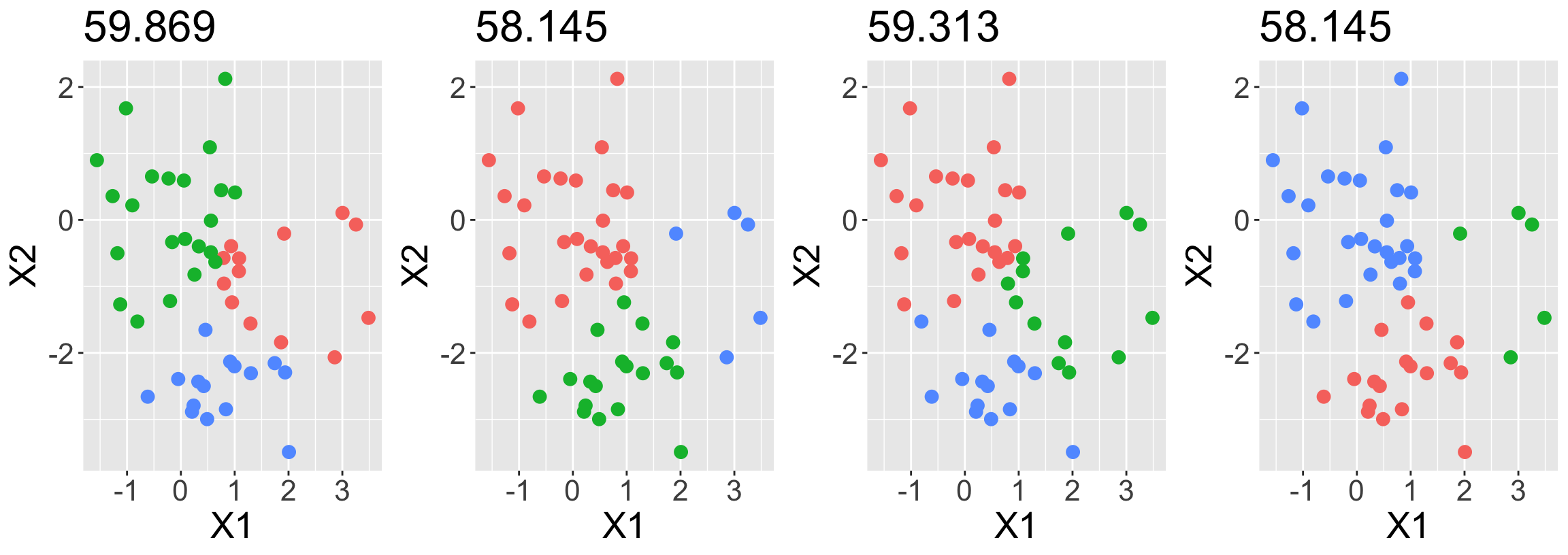 Perform K-means clustering performed four times on the same data with \(K = 3\), each time with different random initialization.