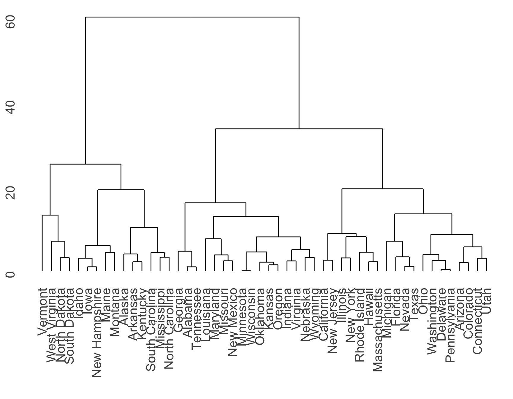 Dendrogram of hierarchically clustered USArrests data using number of Murder arrests (per 100,000) and percent urban population
