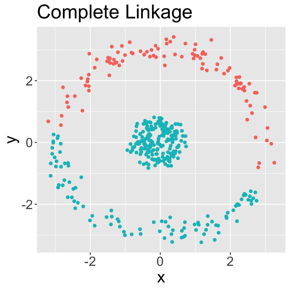 Complete: maximal intercluster dissimilarity. Compute all pairwise dissimilarities between observations in cluster \(A\) and observations in cluster \(B\). Record the largest of these dissimilarities.