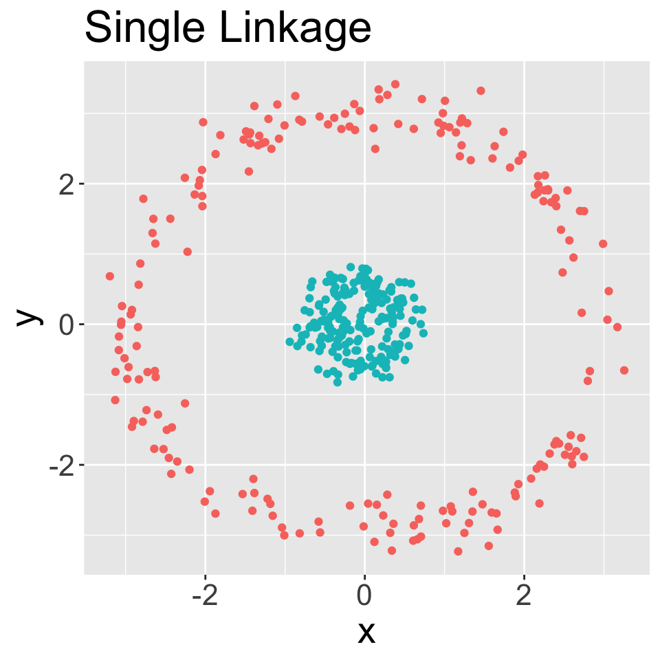 Single: minimal intercluster dissimilarity. Compute all pairwise dissimilarities between observations in cluster \(A\) and observations in cluster \(B\). Record the smallest of these dissimilarities.