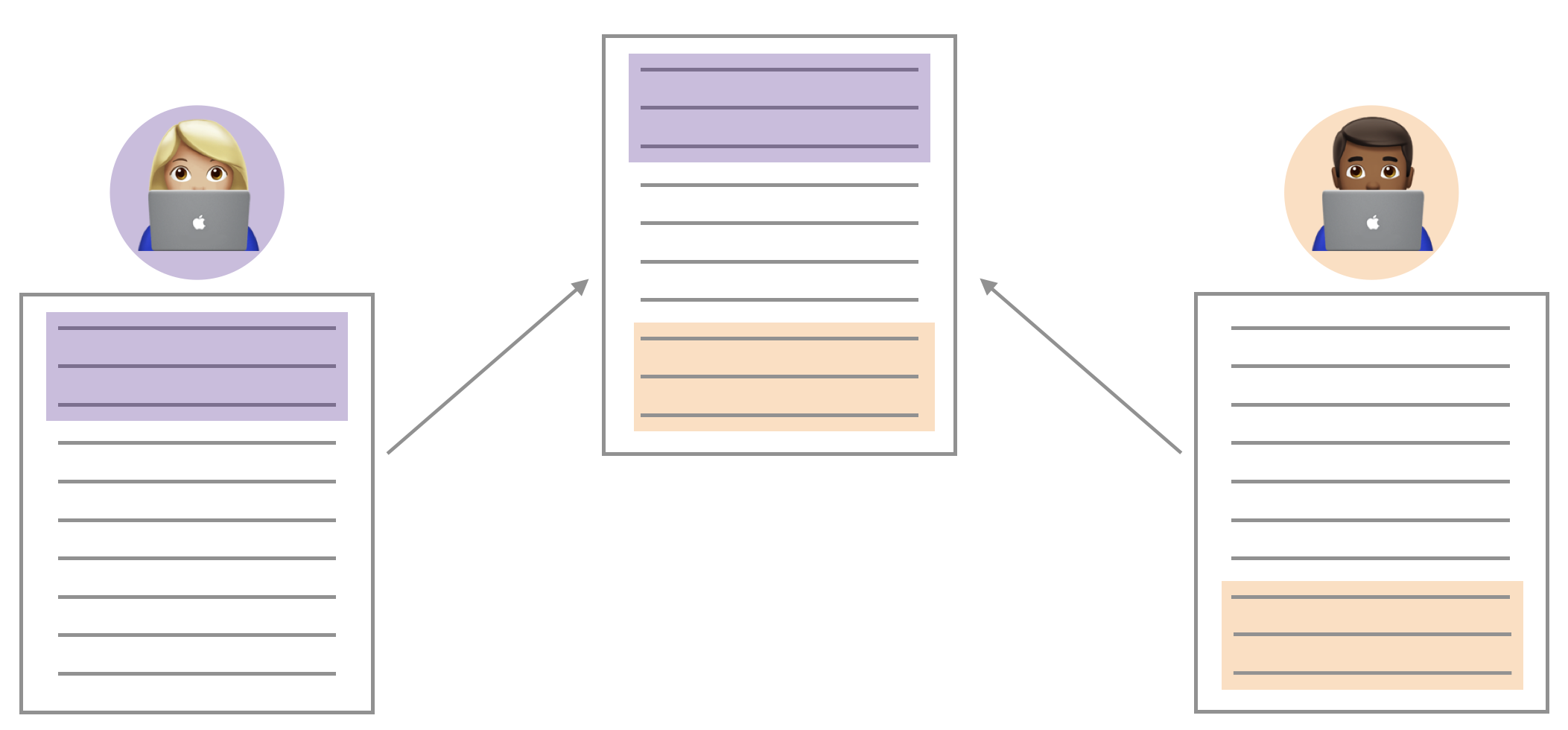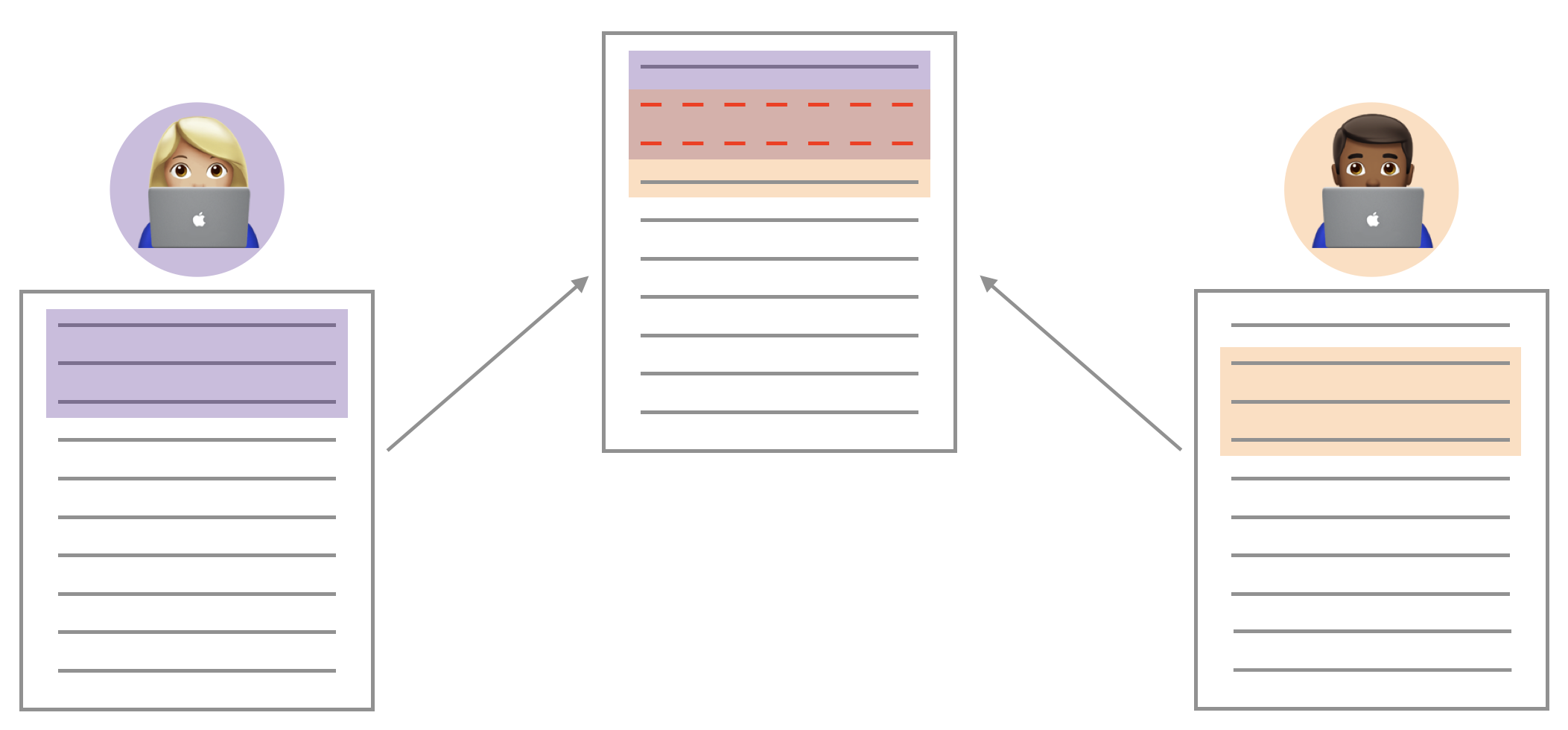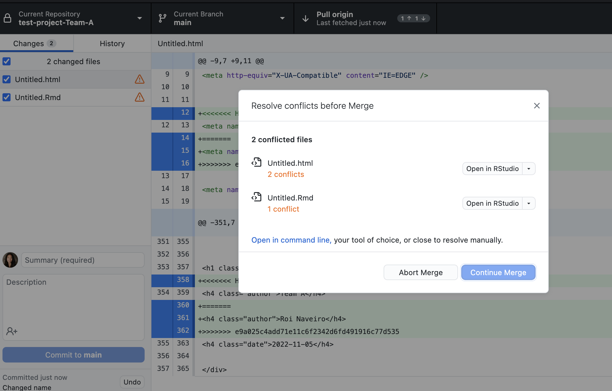 Knit, commit, and push often to minimize merge conflicts and/or to make merge conflicts easier to resolve.